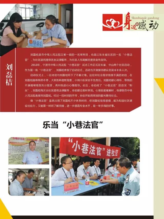 2013年,宁波市中级人民法院“小巷法官”试点工作正式在朱雀、中山两个社区启动,作为第一批“小巷法官”,刘磊桔参加了启动仪式,活动当天就接待群众咨询60余人次。