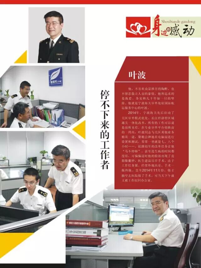 2014年,宁波海关先后启动了关区审单模式优化、长江经济带区域通关一体化改革,所有的工作可以说是前所未有。在专业审单平台切换前的一周内,叶波同志与关区其他业务精英一道,聚精会神地在电脑前进行设置和测试,常常一坐就是七、八个小时……。接踵而至的改革任务让他“马不停蹄”,甚至连生病的时间都没有,可偏偏这时他的脸部出现了皮脂腺囊肿,医生建议尽早手术。由于工作任务紧、经常外地出差,手术一拖再拖。直至2014年11月份,他才抽空去医院做了手术,可当天下午就又被工作拉回办公室。