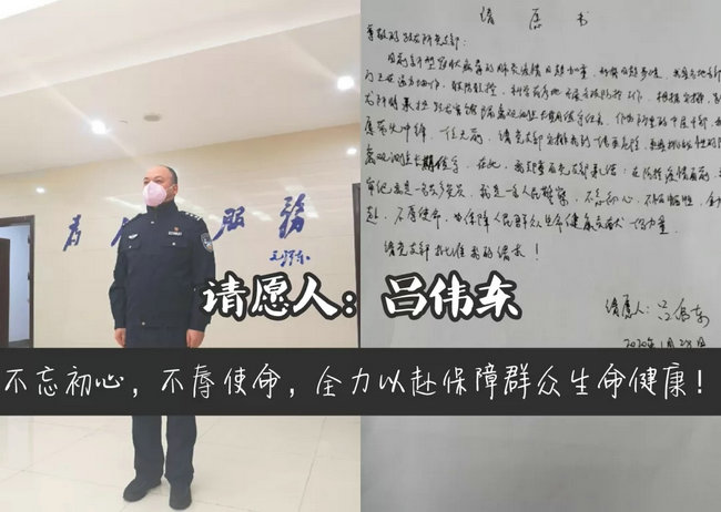 “我愿带头冲锋,一往无前,请党支部安排我到一线更危险、更具挑战性的岗位长期值守。在疫情面前不辱使命、不怕牺牲、不讲代价,冲锋在前、勇于奉献。”1月28日上午,县公安局跃龙派出所吕伟东、叶振宇、杨贤能、冯一品等4名党员民警向派出所党支部递交请战书,主动要求坚守在防控疫情第一线。