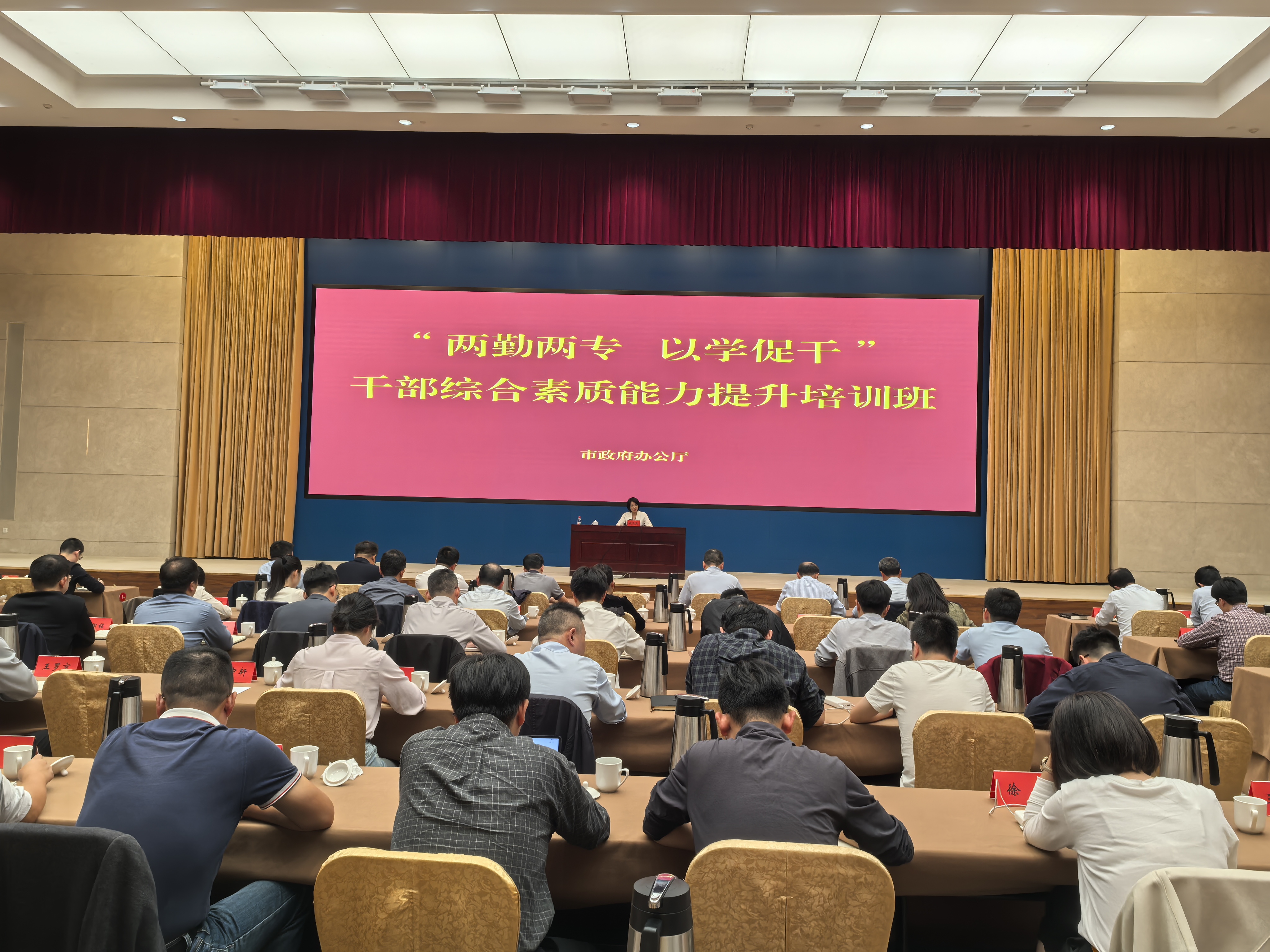 10月24日晚上和25日全天,市政府办公厅利用休息时间举办“两勤两专、以学促干”干部综合素质能力提升培训班,厅机关各处室、各单位处级及以下干部共计100余人参加了培训。市政府副秘书长、办公厅主任杨馥源出席开班式并讲话,市政府办公厅副主任钱鸣燕全程参加培训并在结班式作小结。