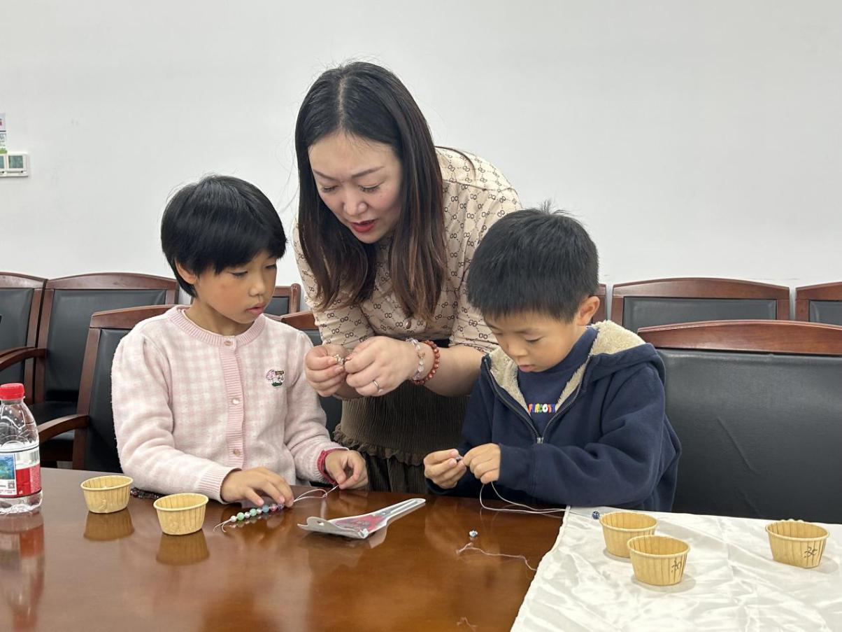 “妈妈,这个珠子穿对了吗?”孩子们举起半成品,眼中闪着光。叶滨和儿子合作完成了一条蓝白相间的手链,儿子儿小心翼翼地为她戴好串珠手链。她眼眶微湿:“平时忙工作,很少有这样的专注陪伴。这串珠子串起了我们的心。”